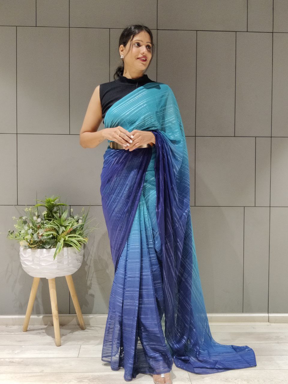1-Min Ready to Wear Saree in Premium Nevy Blue Chiffon With Zari Patta