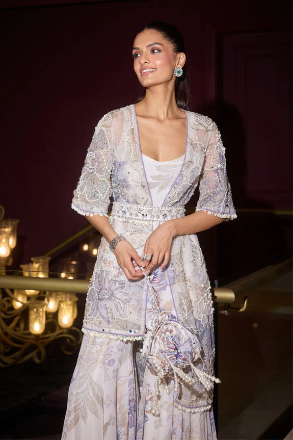 - Included Items Set -includes 1 Bustier, 1 Draped plazo , and 1 Cape for a complete and versatile ensemble.