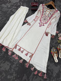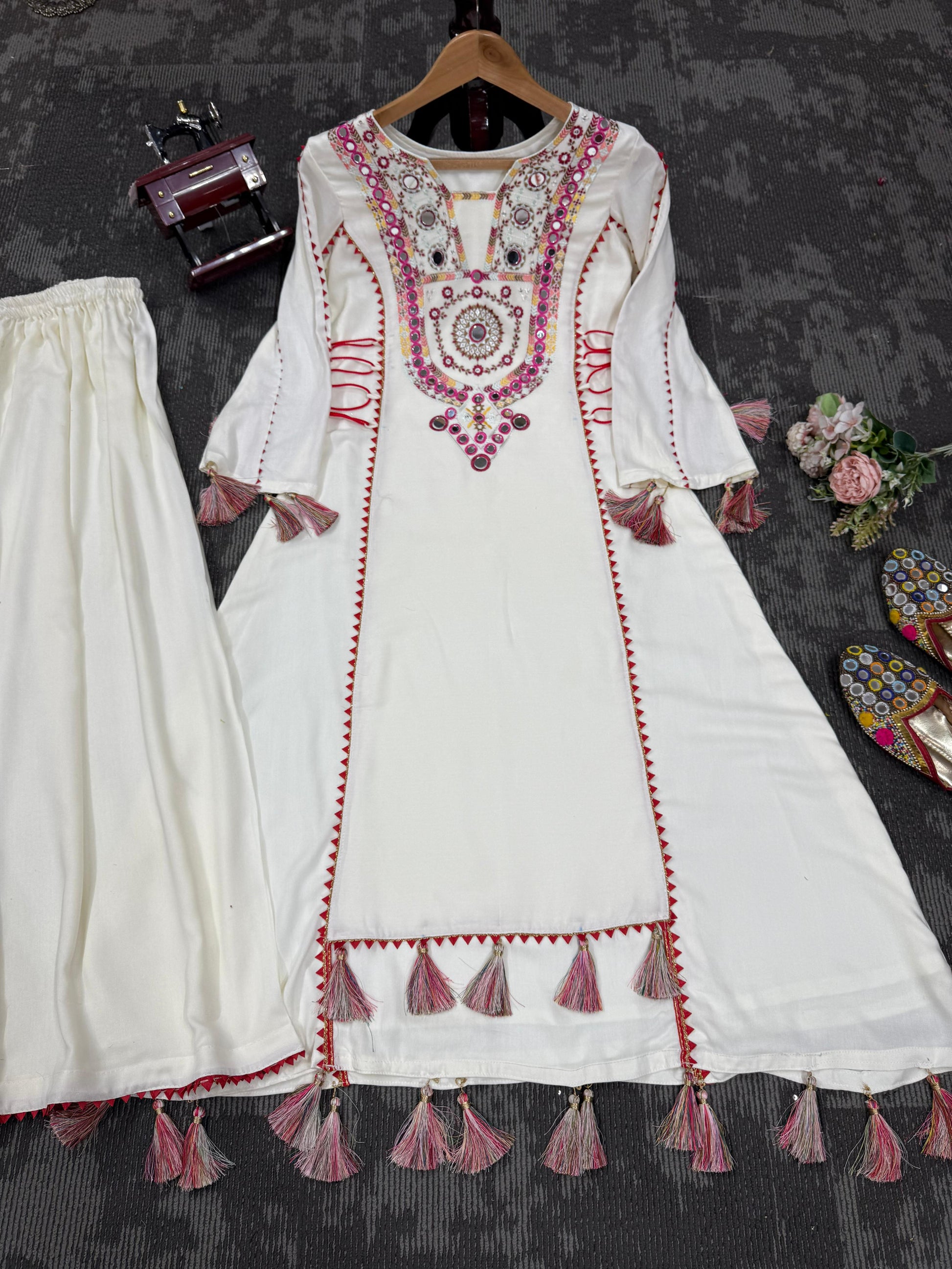 Designer Peplum & Bell Bottom Set On Reyon Febric With Thred & Real mirror work With Tassels and Lace work.