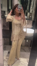β¨ Add a royal glow to your look with this Champagne Gold Co-Ord Set in luxurious Chinon Silk.π« Adorned with delicate embroidery, sequins, and pearl detailing for timeless elegance.π Perfect for weddings, festive nights, and special celebrations.