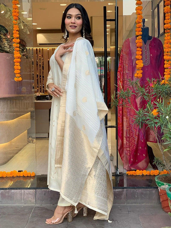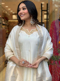 Off White Designer Nack Hand Work Tapeta Silk Kurti With Pant & Dupatta Set