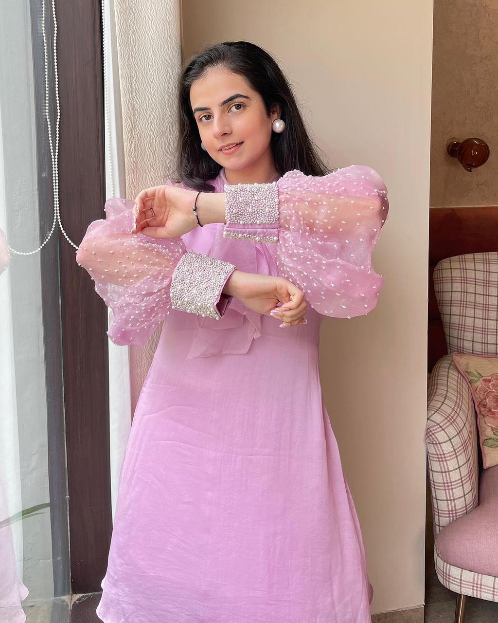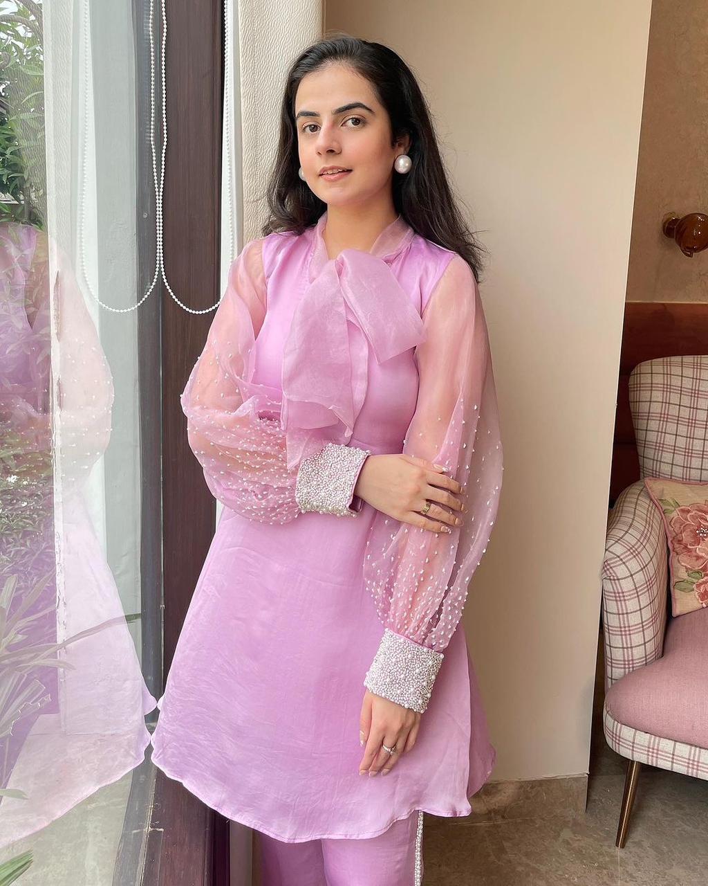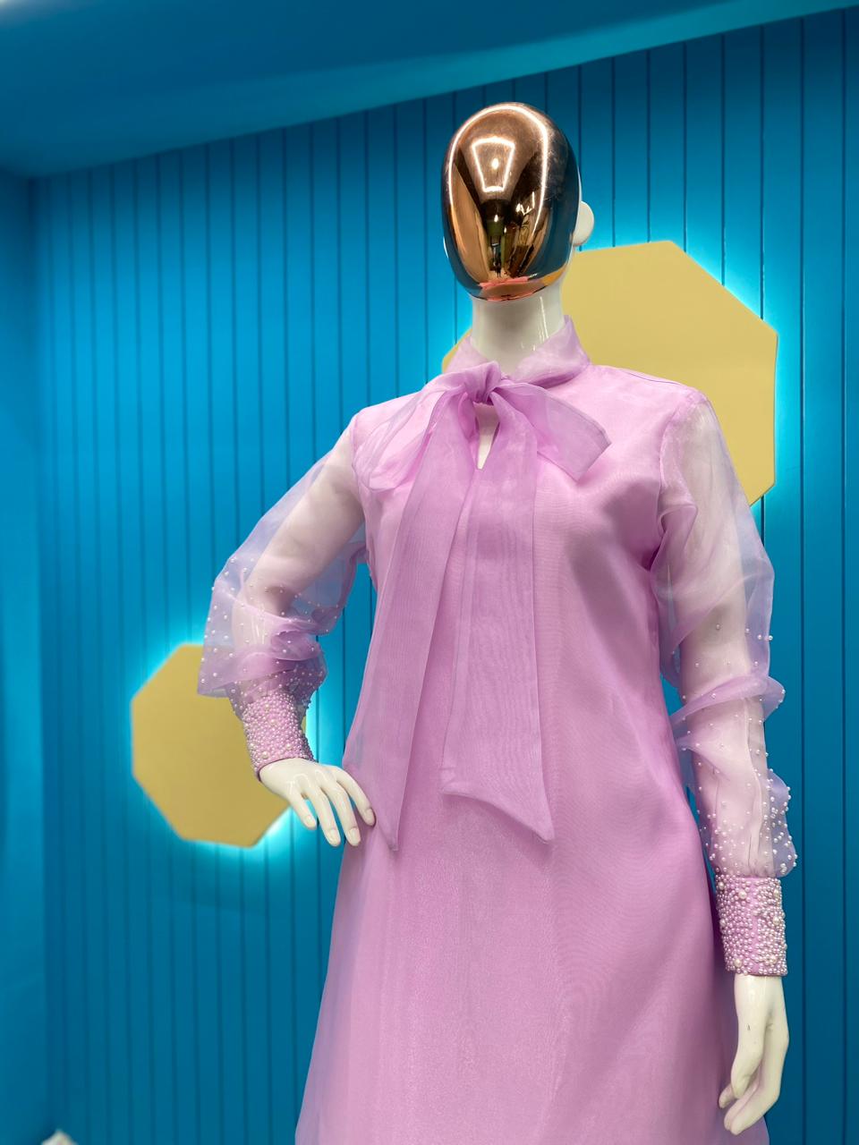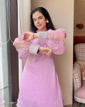 Light Pink Organza Designer Top and Pant Set With Moti Work and Fancy Neck