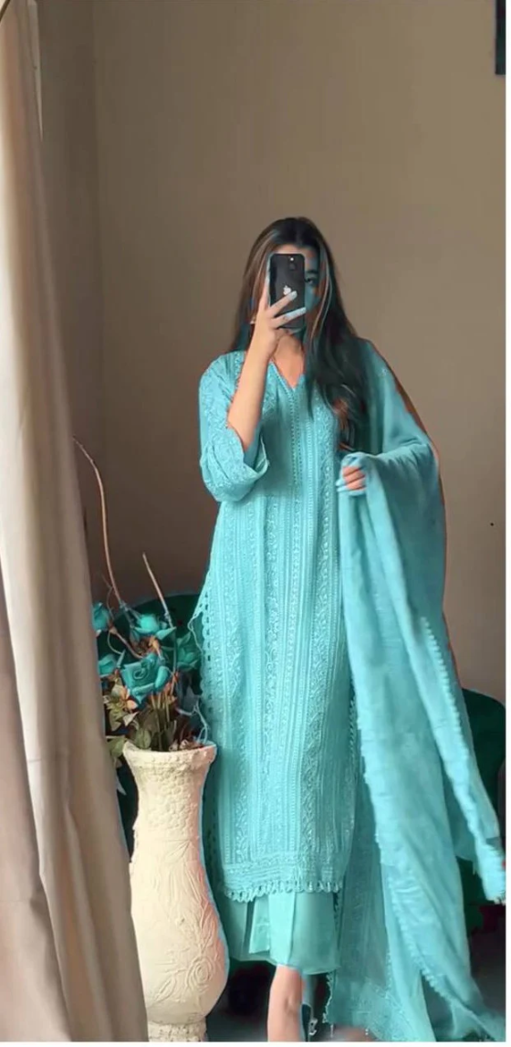 Elevate your wardrobe with this chic and trendy Chinon Top with Cotton Thread Embroidery paired with a stylish Plazo and Dupatta. Perfect for modern women who appreciate elegance and comfort, this outfit combines delicate cotton thread embroidery with intricate GPO lace work, giving you a graceful yet contemporary look.